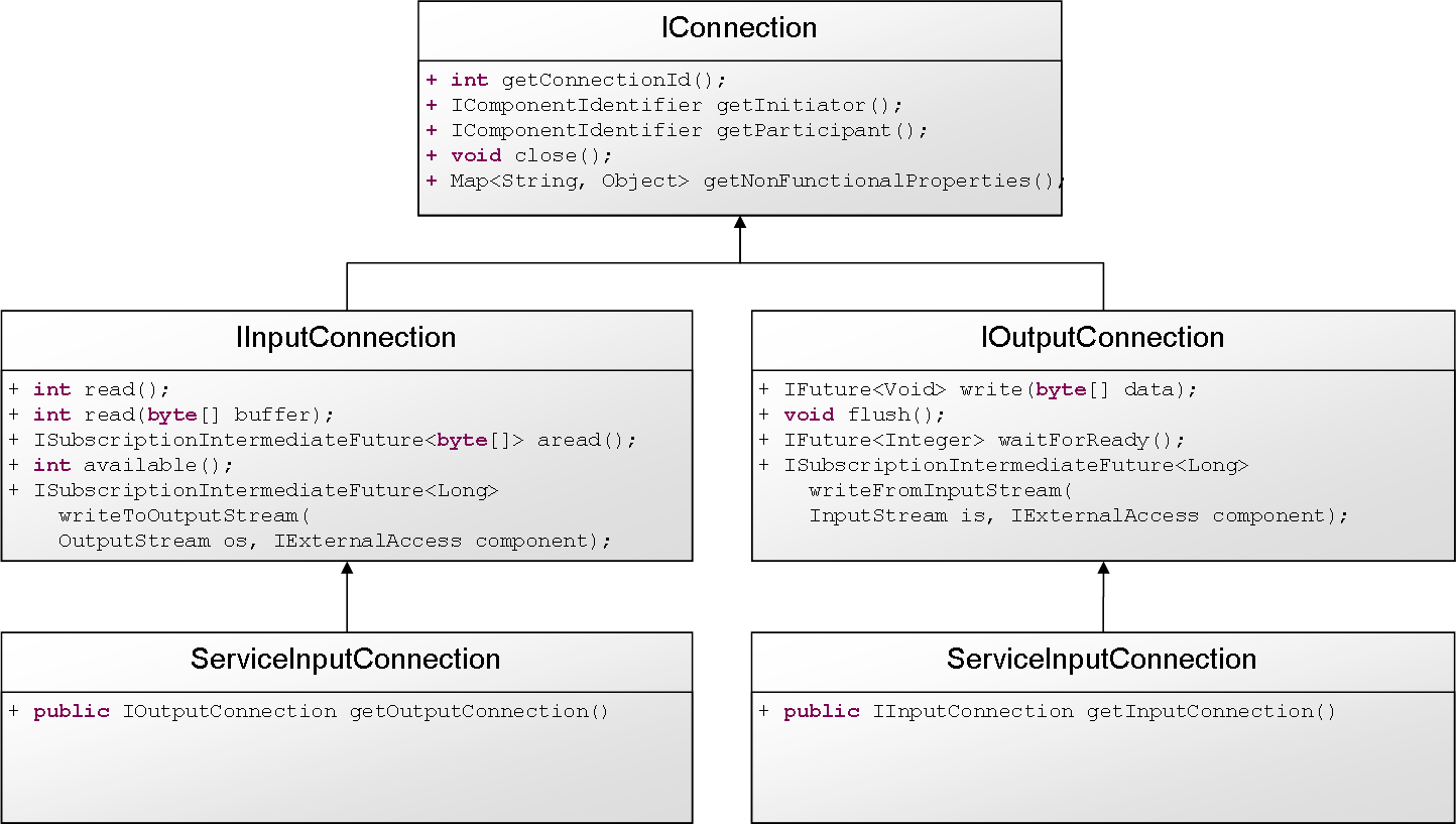 The base interface for all types of Jadex streams is IConnection, which mainly provides methods to get general information about the stream (such as the connection id, the initiator and participant component ids). From this interface IInputConnection and IOutputConnection are derived. These coarsely correspond to the Java InputStream and OutputStream and offer functionalities to read and write data. Finally, the concrete classes ServiceInputConnection and ServiceOutputConnection implement those interfaces and additionally add one important method to get a corresponding output for input connection and vice versa. The idea is that a service connection can be created within a service implementation of a component. The original service connection can then be used to e.g. write or read data and the derived opposite connection can be passed as parameter value in a method call or can be passed back as return value. In this way two services can communicate via streams. In Jadex streaming support is based on two different APIs, a low and a high level one as described next.